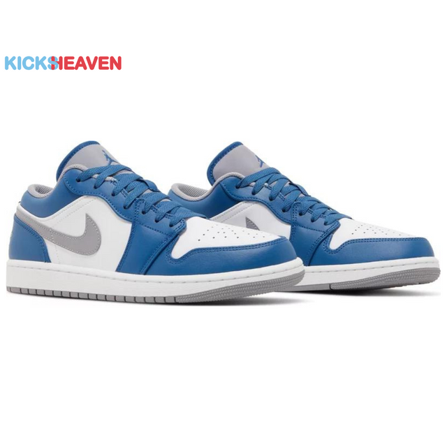 Crafted with premium materials, this Low Air Jordan 1 features a combination of leather and rubber. The upper showcases blue and white leather, with a perforated white toe cap, complemented by blue cotton laces and an underlying grey tongue. Providing support and comfort, the shoe is equipped with a rubber outsole and stitched midsole, housing encapsulated AIR units for cushioning.